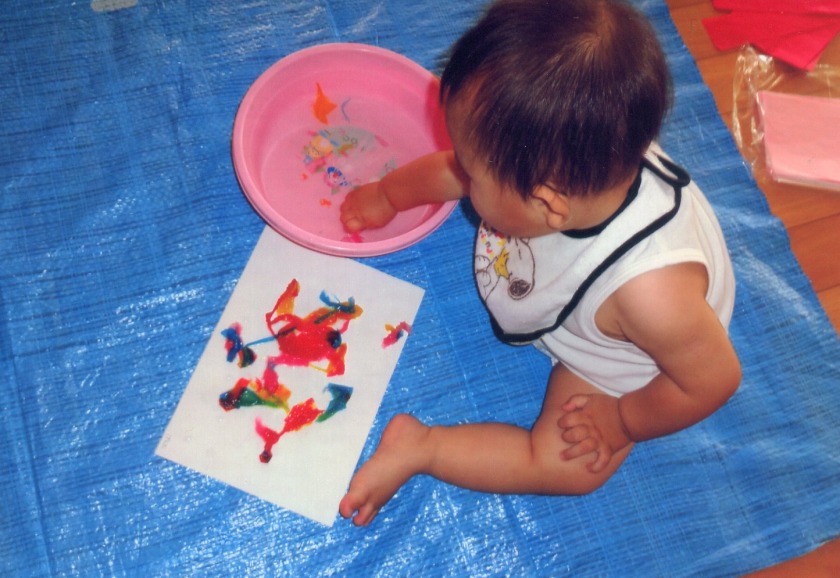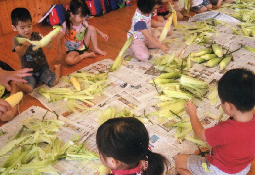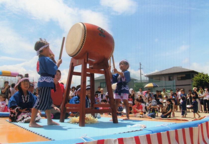少しずつですが、高月齢児は絵本に興味を持ち始め、7月は『すいか』の絵本をよく見ました。どのスイカが美味しいか、保育士が絵本のスイカをポンポンと叩いて、子ども達に絵本を近づけると、同じように叩いたり、切ったスイカの時は、保育士が手を子ども達の口に近づけると、口を開ける仕草も見せてくれます。よく見たことで、お部屋の天井飾りのスイカが同じだということに気づいて上を見る子もいました。絵本は、子ども達の成長をサポートし、豊かな心を育みます。絵を見て刺激を受けたり、親子で絵本を見る時間が子ども達に安心感を与えますので、身近な簡単な絵本から親しんでみて下さい。