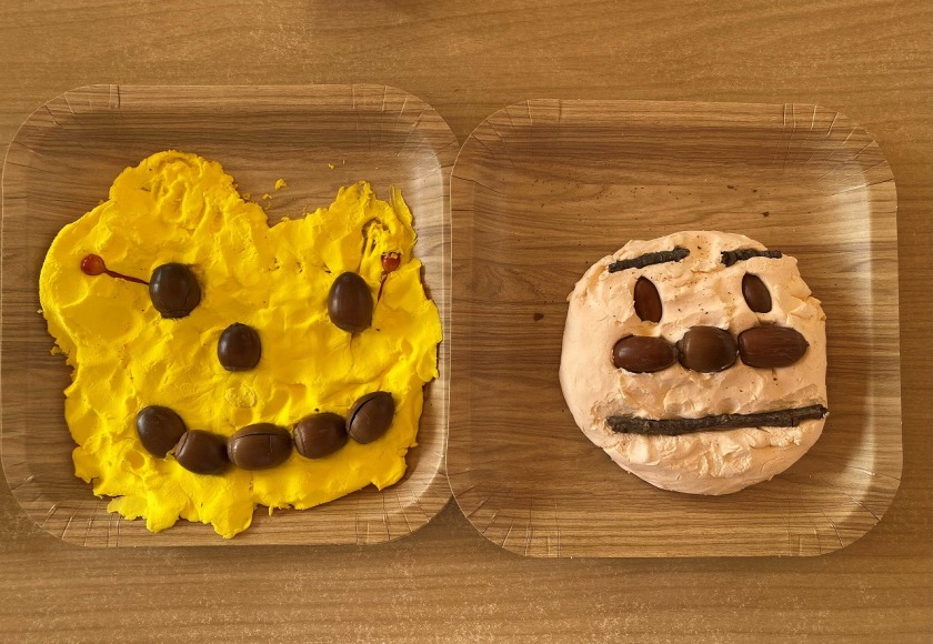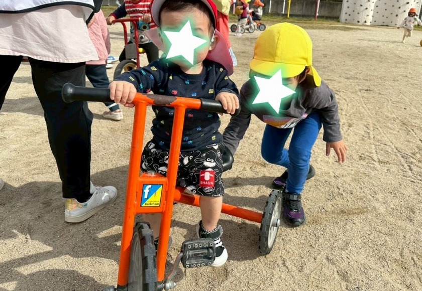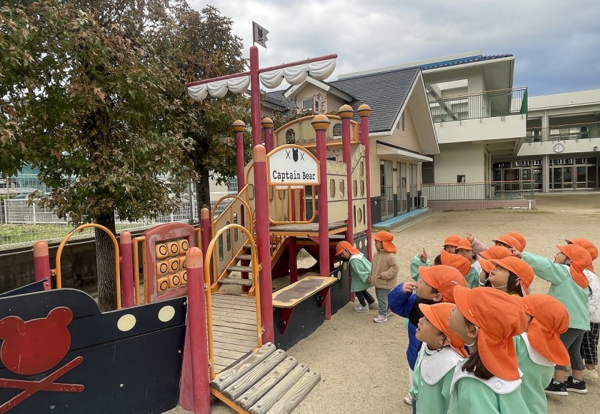 先月は、どんぐり、まつぼっくり、落ち葉等に触れながら保育者と一緒に楽しみました。初めて目にした時は「なに?」と不思議そうにしていた子ども達でしたが、歌などでも触れていくことで少しずつ興味をもち、どんぐりで作ったマラカスは大喜びでした。散歩で落ち葉拾いに行くと一生懸命集める子、保育者から手渡されたはっぱを大事に持っている子、手のひらで握って感触や音を楽しむ子と反応は様々でした。中には、「はっぱ」「ぱっ」と言いながら拾った葉っぱを保育者に見せてくれる子もいました。短い秋でしたが、秋の自然は子ども達に好奇心とそこから発せられる言葉をプレゼントしてくれました。