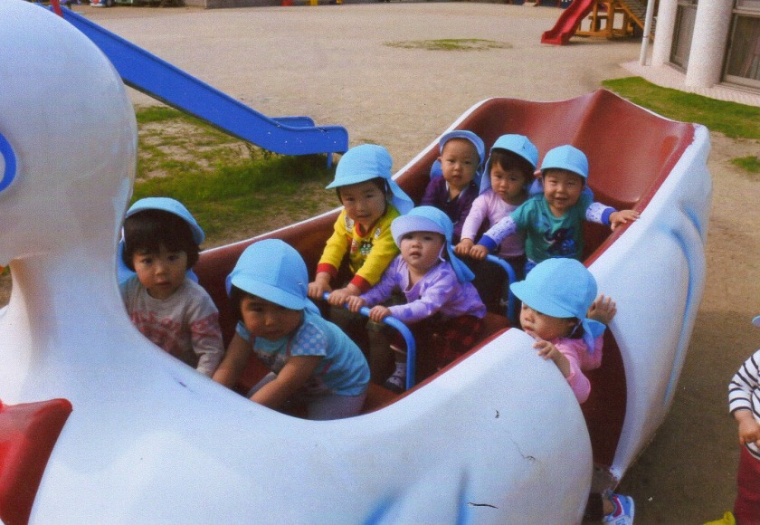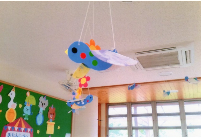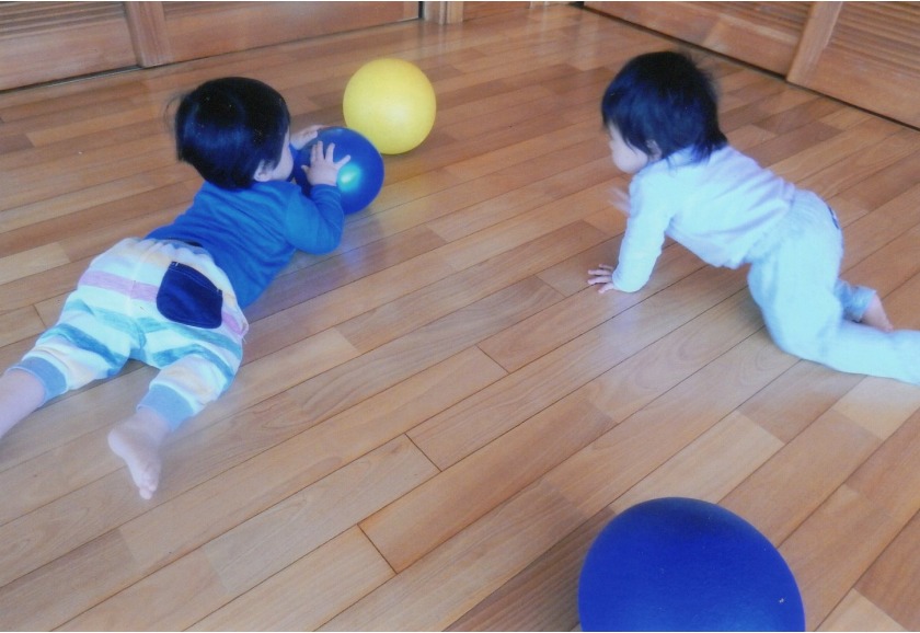 子ども達は、ずり這いやハイハイで動き回ることが大好きで、保育者の後ろや転がるボールを追ったりして楽しんでいます。部屋だけではなく、テラスやホールなど場所をかえることで、のびのびと体を動かし、より探索活動が活発になっています。ハイハイが上手になると、立つことにも興味が出て壁や柵につかまり立ちをしたり、一人で何秒間か立つこともできるようになった子もいます。立てるようになると興味は垂直方向へと向かい、高いところに手を伸ばして興味があるものとったり、ひっぱったりします。