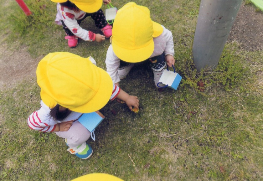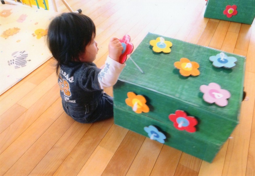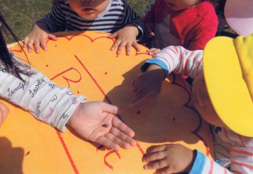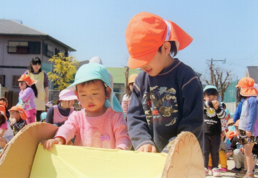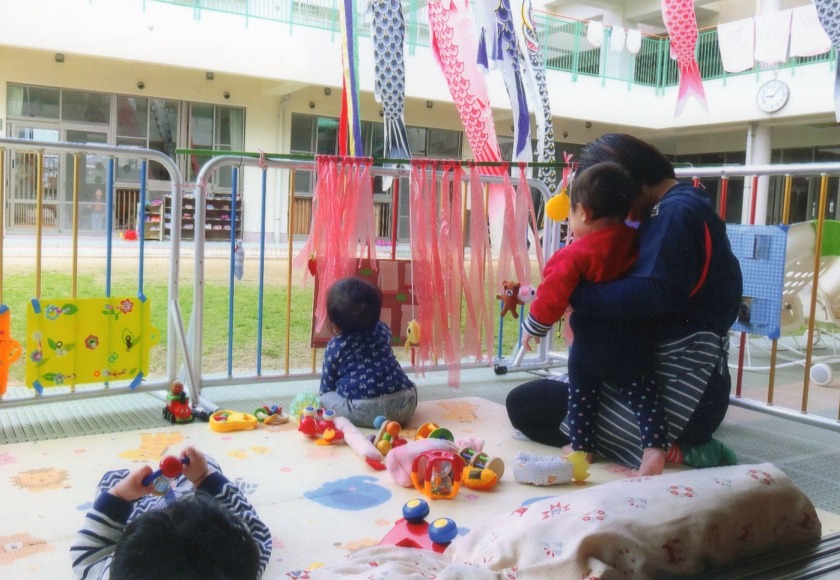 室内だけでなく、テラスや戸外に出ながら気分転換を図り、心地よい風を感じたり、ポカポカと日ざしを浴びながらいつもと違う空間で遊んでいきました。テラスに準備していると、待てずにゴソゴソ這って、小さな段差を乗り越えて部屋から出てくる子もいました。テラスでは、中庭を泳ぐ鯉のぼりをじっと眺めたり、いろいろな年齢の子ども達が、声をかけてくれて触れ合う機会ももてました。また、カートに乗っての散策では、気持ちよく、毎回必ず誰かはウトウト眠ってしまっています。健康な体作りの一つとして外気浴や散歩を取り入れていますが、その効果として