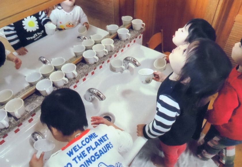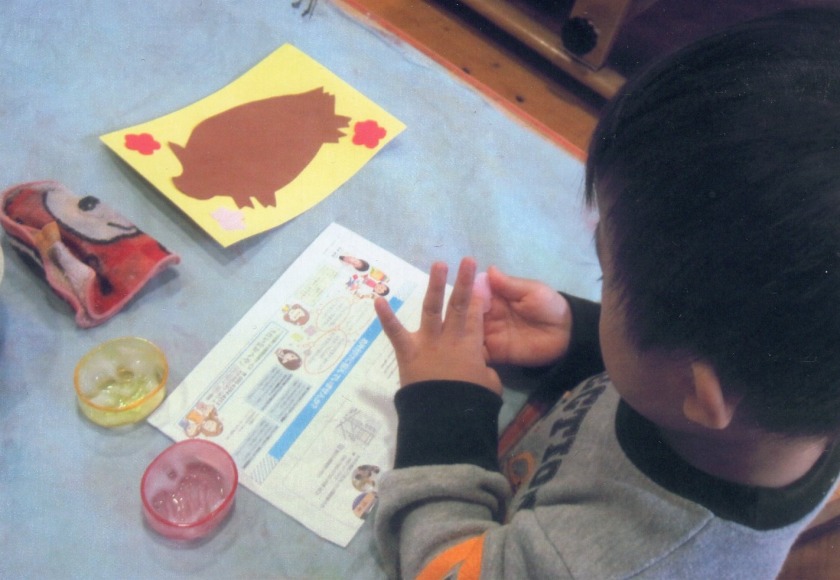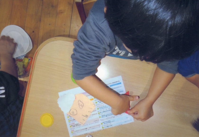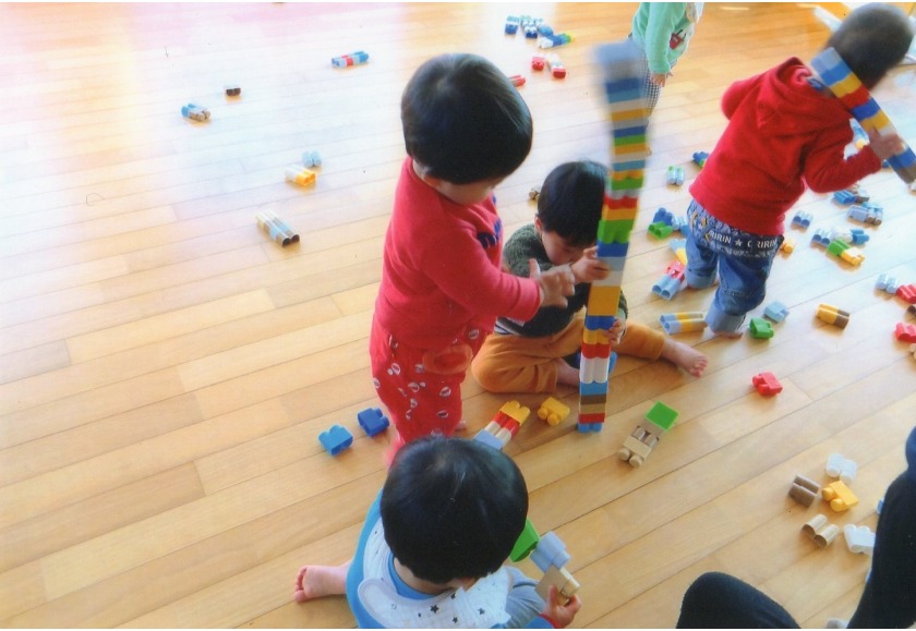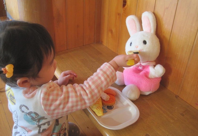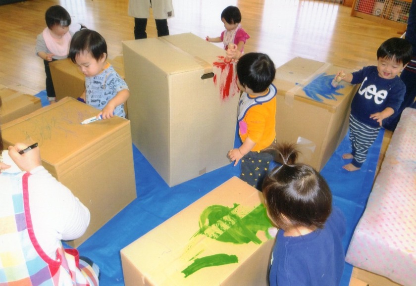 毎日小さなお手伝いを頼んでいます。それは、お部屋から玄関までの靴運びです。自分の靴だけではなく、お友達の靴も運びます。持てる子は、片手に一足ずつ持つことができ、時には靴を落としながらも二足を運んでいます。以前は高月齢児だけでしたが、今は低月齢児の子も入り、片方ずつ持ち、途中止まっていろいろなところに興味を示しながら歩いています。玄関まで長い道のりですが、少しずつ覚えてくれると思います。何回も行っている子は、保育士の動きなどで察知し、遊びを止めて自ら来るなど積極的で、子ども達にとっては楽しいお手伝いになっているようです。“お手伝い”と言っても、子ども達にとっては遊びの一つのようなもので、ご家庭でも一つでも楽しんでできることがあるとよいですね。