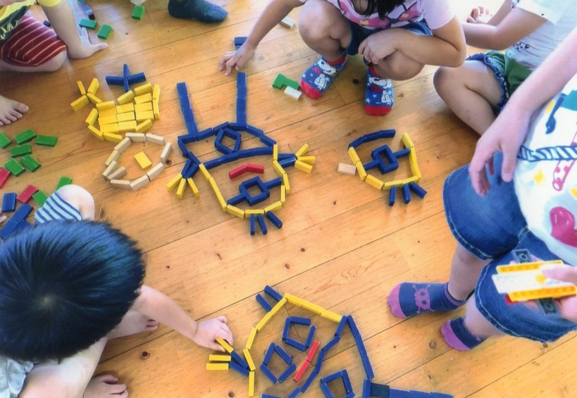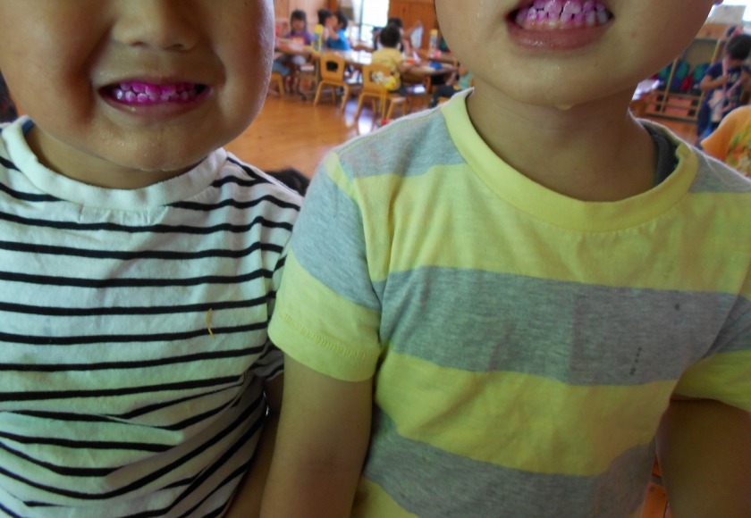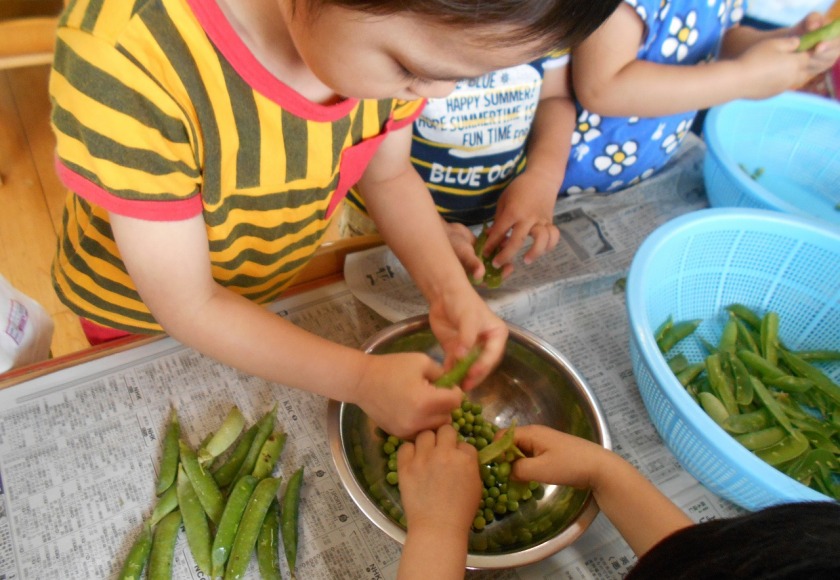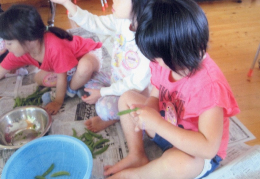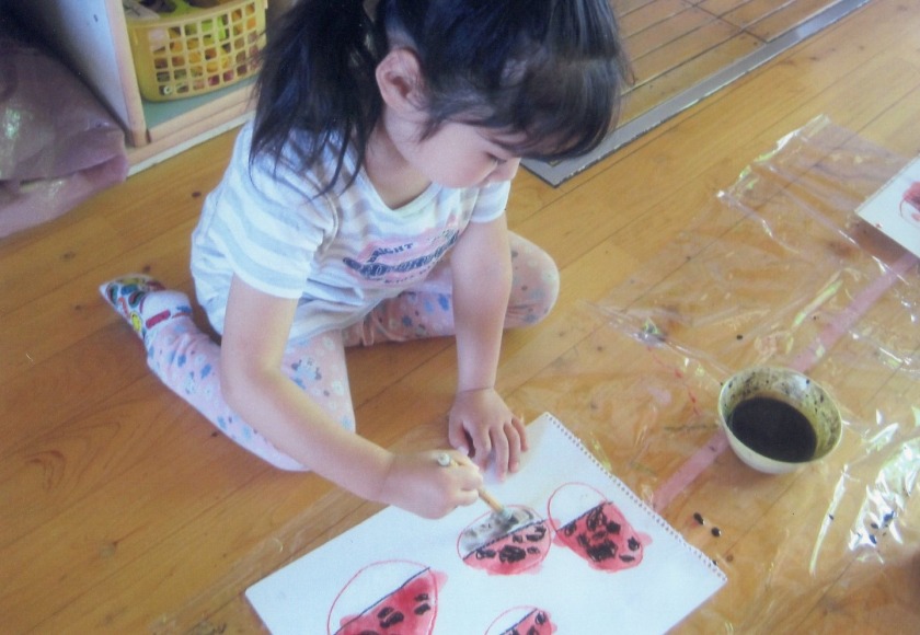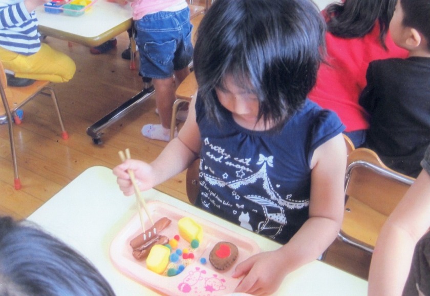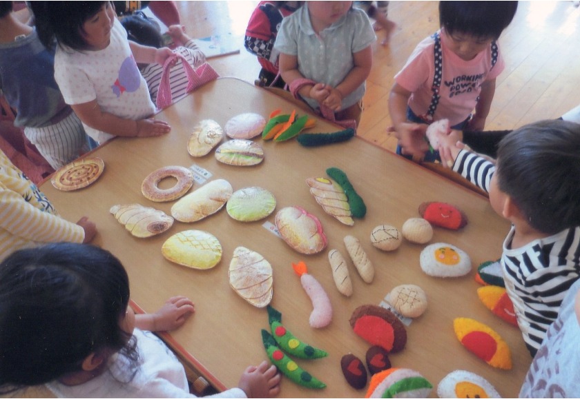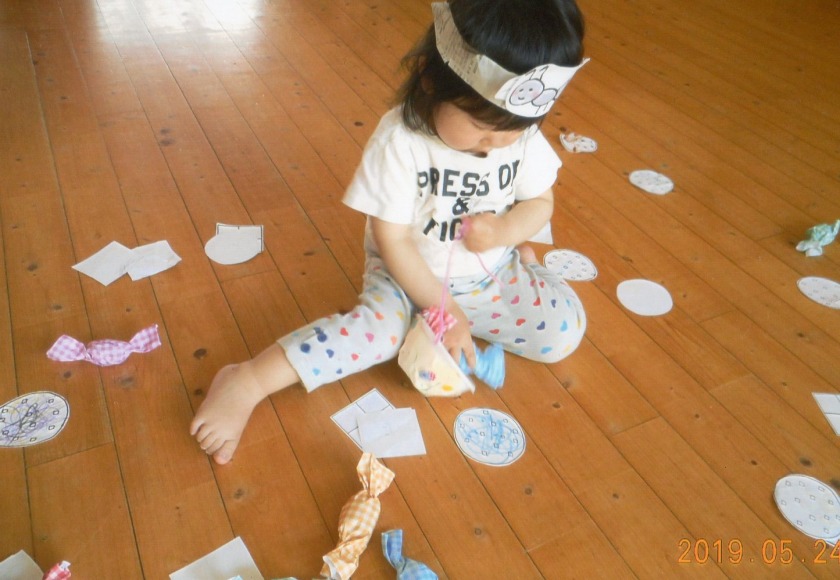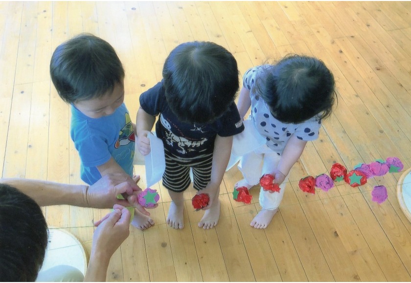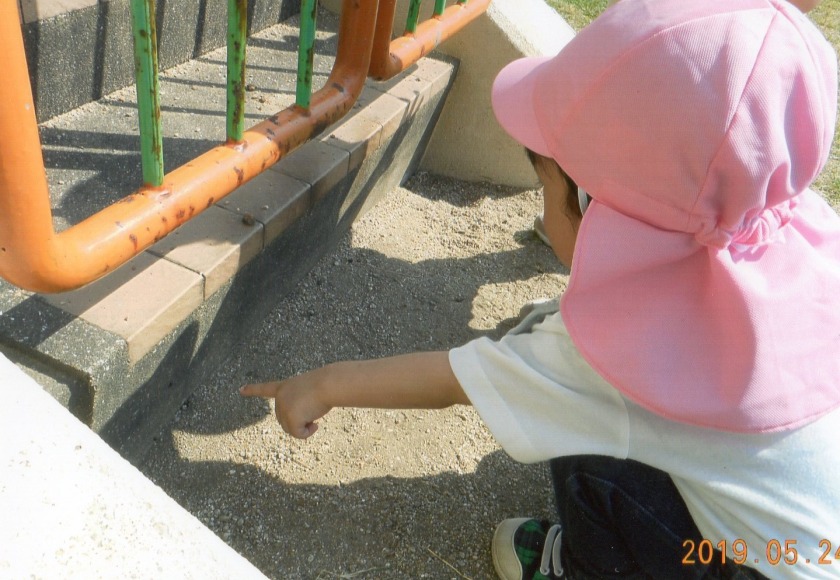 先月は、カートに乗って園庭散策や中庭の芝生の上で遊びました。中庭を飛ぶつばめや保育者が捕まえたてんとう虫を見せると、指をさしてじっ~と見ていたり、「おぉ~、くぅ~!」と声に出してリアクションしたり、中には実際に触ってみて、摘まんで口元まで持っていこうとする子もいたりと…子ども達の様々な反応が見られました。また、ときおり吹く、さわやかな風に目を細めて喜ぶ子もいました。自然物は、生き物や植物だけではないので、生活の中で感じことができる『自然』を大切にし、子ども達にわかりやすい表現で(「葉っぱを優しく揺らす風って気持ちがいいね。」「可愛い小鳥さんの声が聞こえるね。」など)伝えていきたいと思っています。