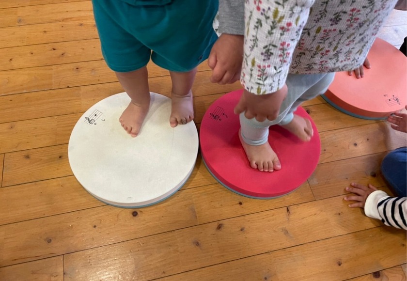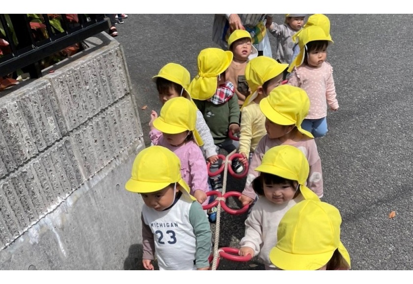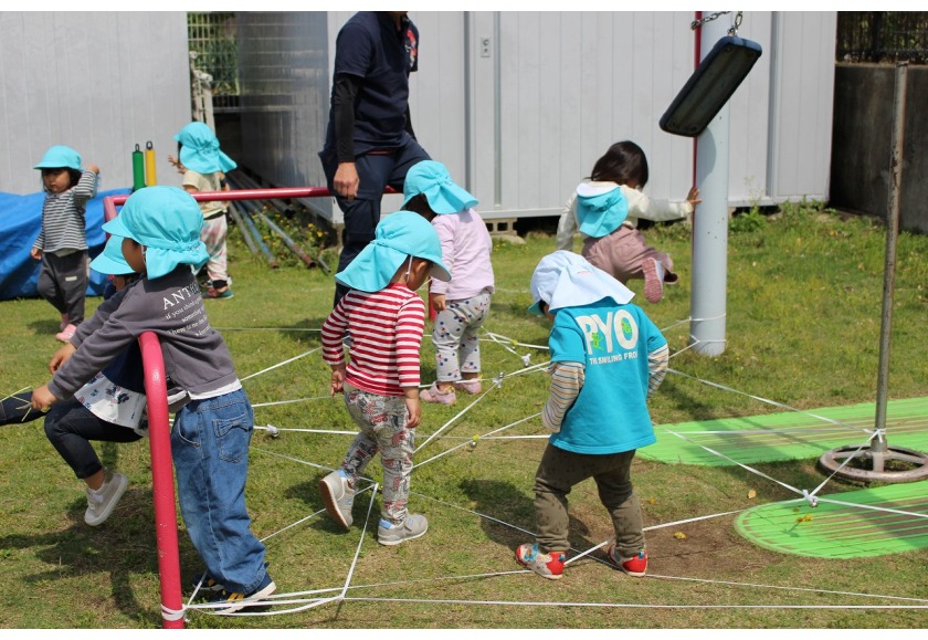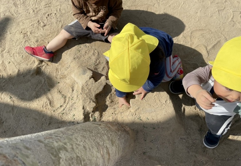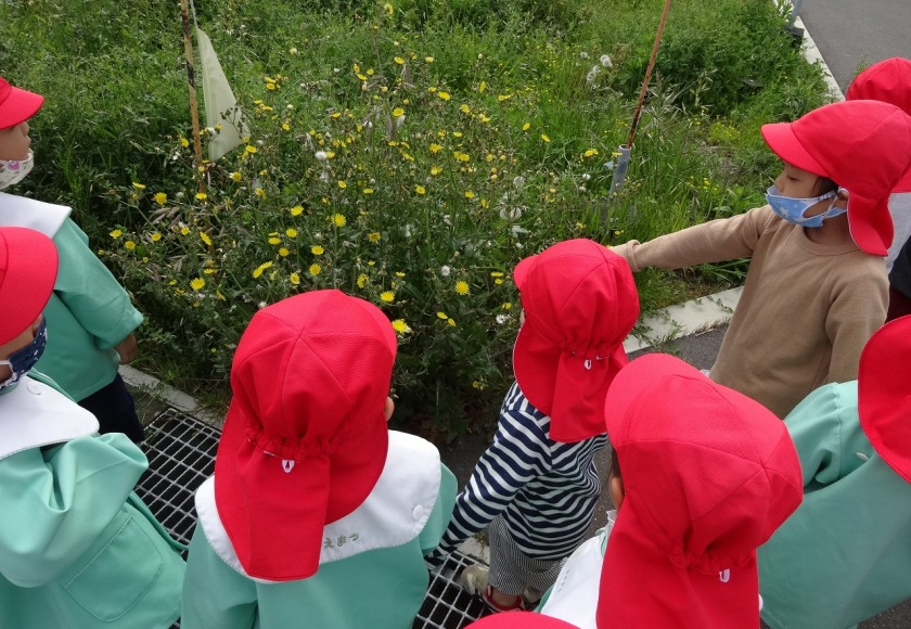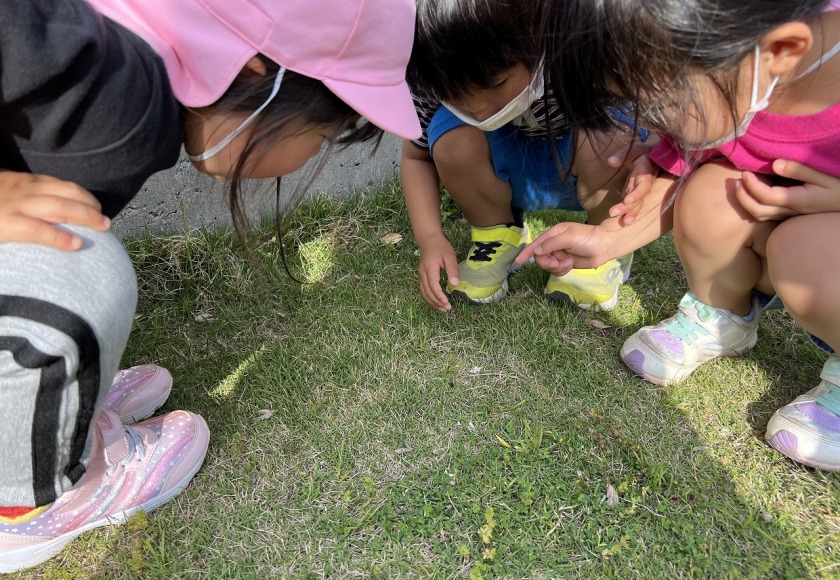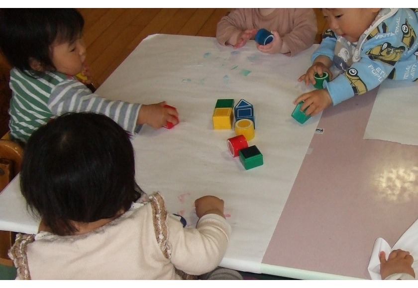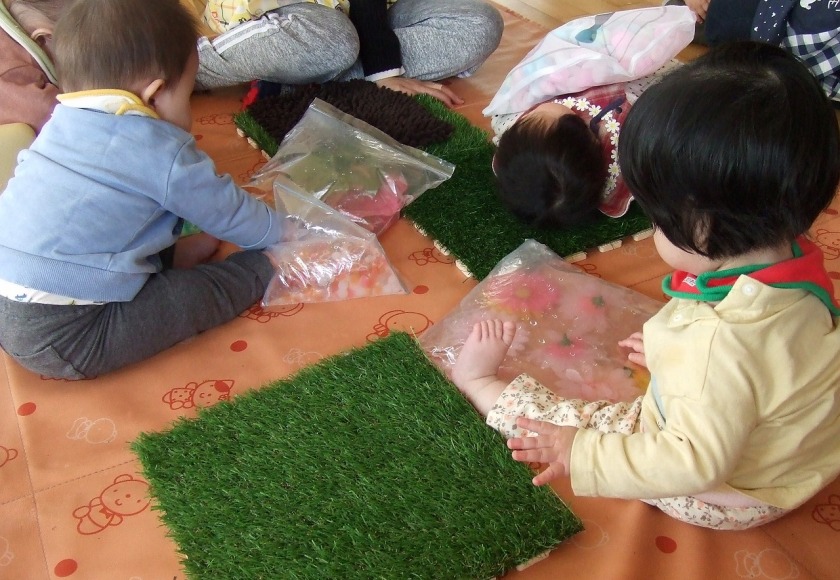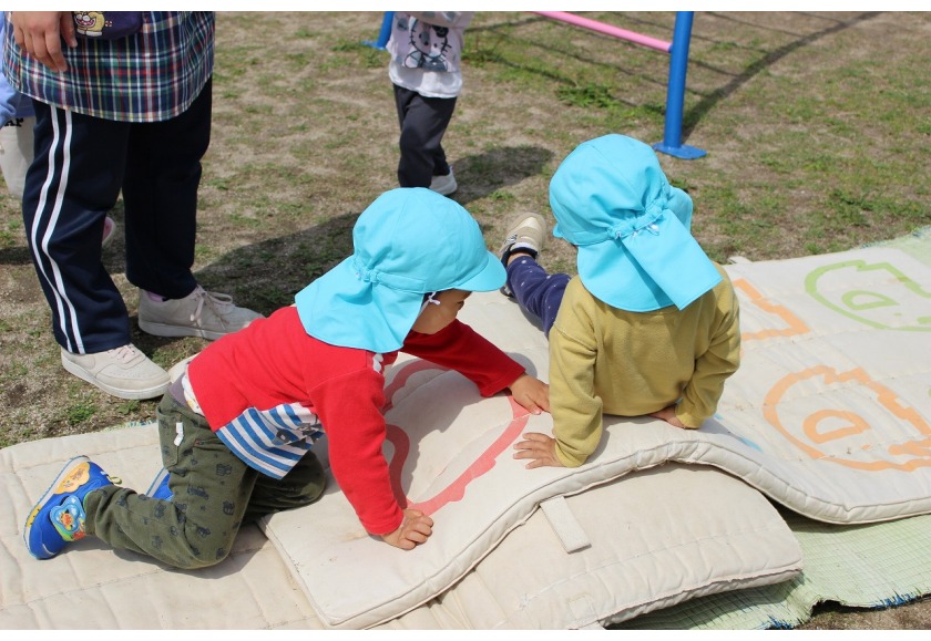 4月は新しい環境の中、不安を感じている子ども達と積極的に触れ合いを持ちながら、保育者との信頼関係を築いていきました。寝ている月齢の低い子ども達も仰向けに寝かせるだけではなく、少しずつ腹這いの姿勢で遊ばせていくことで、いろいろな姿勢に慣れ、目で見える物も変わり世界観が広がっていきます。(座位からのつかまり立ちも同じです。)腹ばいで遊ぶことで、腕や胸の筋力をつけハイハイを始める準備へと繋がります。前にある玩具や人に近づこうと次第に腹ばいで前進します。「ハイハイ」は、移動できる喜びを味わえるだけでなく、手や足腰の育ちに大切です。最近では、平面だけでなくフワフワマットや段差・でこぼこした場所でもハイハイを挑戦している子ども達です。