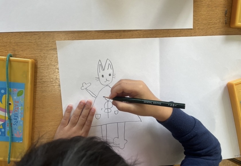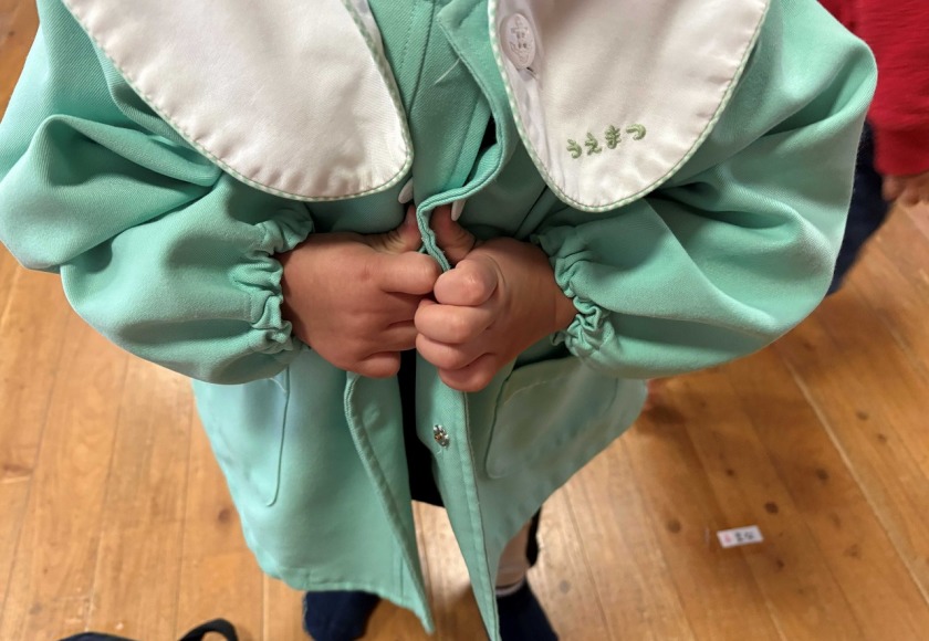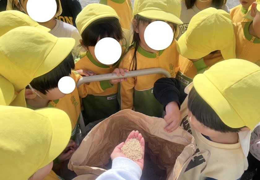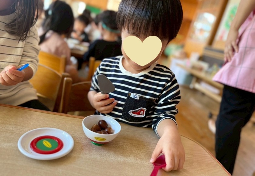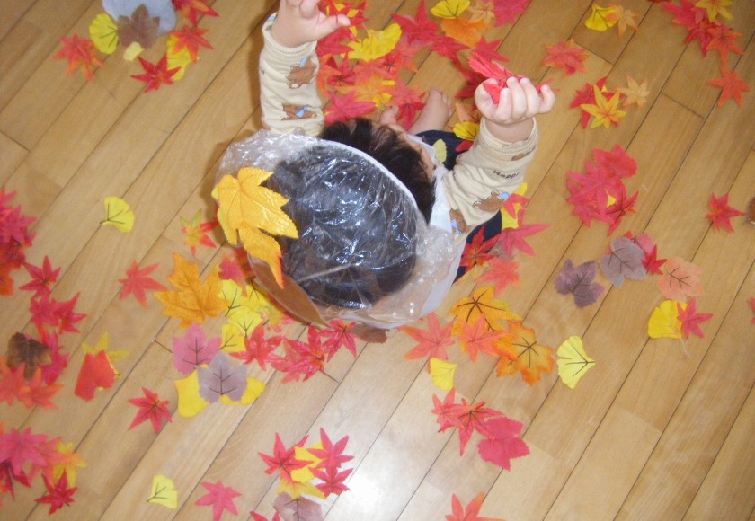 先月は、どんぐり、まつぼっくり、落ち葉等に触れながら保育者と一緒に楽しみました。初めて目にした時は「なに?」と不思議そうにしていた子ども達でしたが、歌などでも触れていくことで少しずつ興味をもち、どんぐりで作ったマラカスは大喜びでした。散歩で落ち葉拾いに行くと一生懸命集める子、保育者から手渡されたはっぱを大事に持っている子、手のひらで握って感触や音を楽しむ子と反応は様々でした。中には、「はっぱ」「ぱっ」と言いながら拾った葉っぱを保育者に見せてくれる子もいました。短い秋でしたが、秋の自然は子ども達に好奇心とそこから発せられる言葉をプレゼントしてくれました。